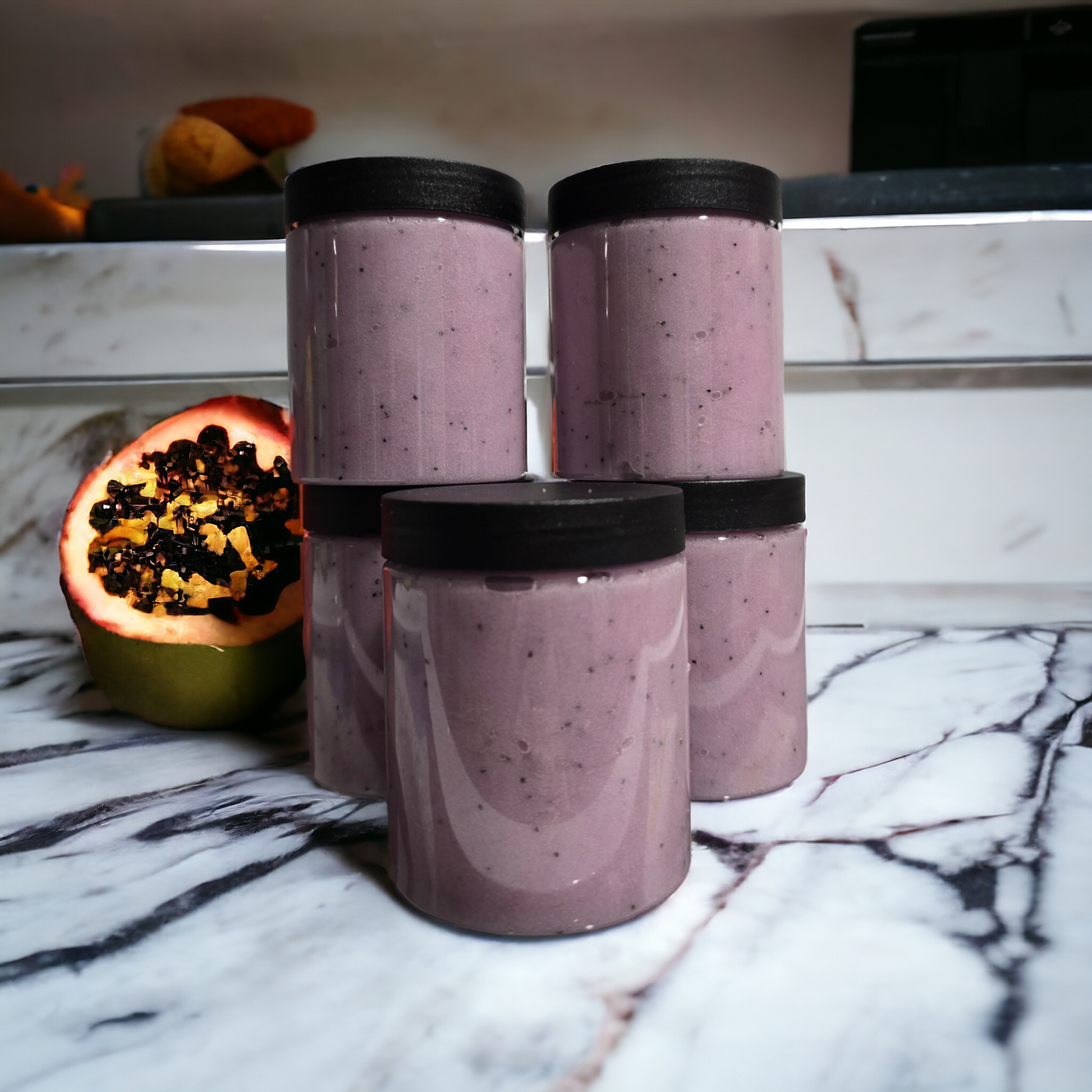 Ingredients: Sugar, Shea Butter, Mango Butter, Avocado Oil, Sweet Almond Oil, Glycerin, Optiphen, Emulsified Wax, Fragrance, Mica, Poppy seeds